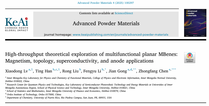 近日,我院吕晓东副研究员、宫箭教授 (内蒙古师范大学兼职教授,博士生导师) 与内蒙古大学李锋钰教授、美国波多黎各大学陈中方教授合作在理论设计新型功能二维材料领域取得新进展,相关成果以“High-throughput theoretical exploration of multifunctional planar MBenes: Magnetism, topology, superconductivity, and anode applications”为标题发表在国际材料科学期刊《Advanced Power Materials》上(中科院1区top期刊,IF = 24.9)。吕晓东副研究员为第一作者,李锋钰教授、宫箭教授、陈中方教授为论文共同通讯作者,内蒙古师范大学为第一完成单位。(论文链接:https://www.sciencedirect.com/science/article/pii/S2772834X25000338)。