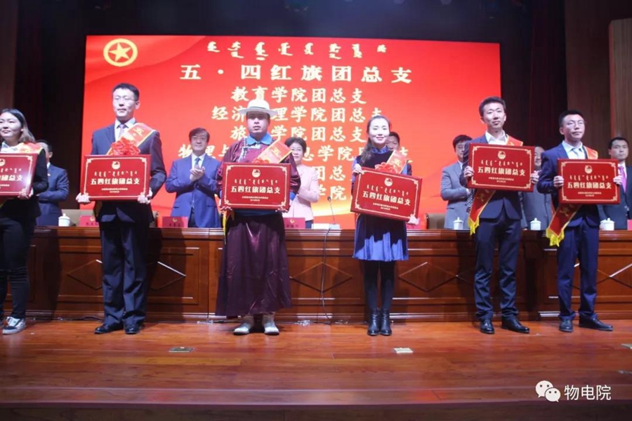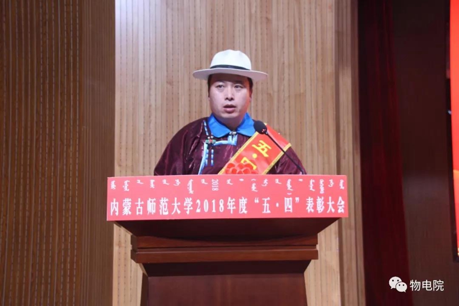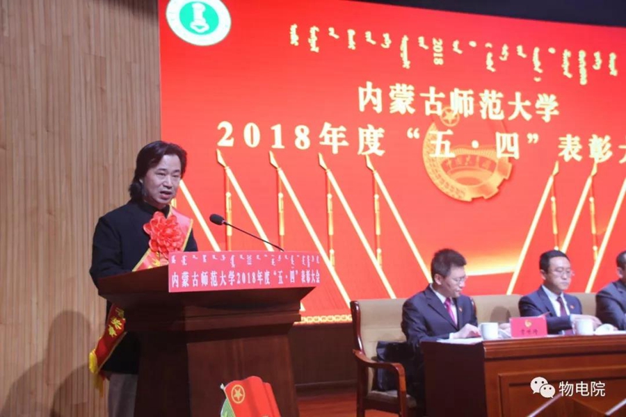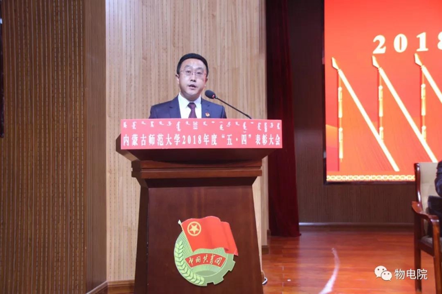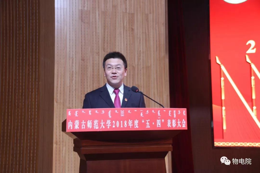本网讯: 为纪念五四运动100周年暨共青团成立97周年,4月28日上午,我校2018年度“五·四”表彰大会在盛乐图书馆二楼报告厅隆重举行。内蒙古师范大学党委书记黄雅丽,副校长刘九万、王来喜,党委委员、宣传部部长张宝成,党委委员、研究生院长张玉柱,党办主任特格希,学生工作部部长斯钦,以及我院党总支书记刘美玲,副院长曹永军,党总支副书记兼副院长张伟,团总支负责人木其尔,辅导员宋鑫伟出席本次表彰大会。大会由校团委书记贾世琦主持,在本次表彰中我院师生共21人获得11项荣誉。 大会在激昂的国歌中拉开序幕。首先,《我和我的祖国》万人快闪视频在大会现场首发。“我和我的祖国,一刻也不能分割,无论我走到哪里,都流出一首赞歌……”经典的旋律传来,全体老师和同学们纷纷起立合唱,内心燃起千万豪情。随后,贾世琦书记对2018年度全校共青团工作进行了总结,对过去一年的共青团工作进行说明报告,在报告最后指出,按照“凝聚青年、服务大局、当好桥梁、从严治团”四维工作格局,全面部署,突出重点,打造特色,为开创全校共青团工作新局面而不懈努力。 学生工作部部长斯钦宣布表彰决定 我院获奖代表上台领奖 获奖代表发言 颁奖仪式结束后,黄雅丽书记做重要讲话,首先,她代表学校党委向受表彰的先进集体和个人表示热烈的祝贺,并说明,举行表彰大会的目的,就是为了选树先进典型,让五四精神深深融入广大青年的血液。希望获奖的集体与个人再接再厉、锐意进取,领导团员青年立足“双一流”建设,为把学校建设成为特色鲜明的创新型高水平综合性师范大学贡献青春力量。随后,她对广大青年学生提出七点希望:第一,立鸿鹄志,做坚定信念,志在天下的师大青年。学生时代是立志成才的黄金时期,青年学生应胸怀祖国人民,把个人发展进步与国家的前途命运紧密结合起来,把报效祖国作为自己的最大追求;第二,修身立德,做正心诚意、厚德载物的师大青年。人无德不立,国无德不兴。作为新青年,应努力培养刚正不阿的浩气,昂扬向上的斗志,持之以恒的品德和百折不挠的精神,自觉践行社会主义核心价值观;第三,学会学习,做博闻广识、本领过硬的师大青年。青年时期是人生最好的学习时光,如果不能拥有真才实学,就会迅速被社会发展所淘汰。广大青年应树立时不我待的紧迫意识,珍惜宝贵时光,勤奋刻苦学习,努力成为可堪大用、能负重任的时代新人;第四,学会合作,做精诚团结、乐于奉献的师大青年。合作共赢已经成为新时代的主题,青年人要想取得成功,必须融入社会、融入团队,努力培养交流意识和团队精神,以诚待人;第五,笃实力行,做实干担当、奋斗筑梦的师大青年。成功源于实干,破败始于空谈。广大青年必要迈稳步子、夯实根基,切忌心浮气躁、朝三暮四、急功近利。在仰望星空的同时,也要做到脚踏实地;第六,学会分享,做内心有光、传播正能量的师大青年。拥有正能量的人自带光芒,会带给人热情和希望,美好和芬芳。即使面对阴暗,也要尽力善良、尽力温柔。永远赤诚善良、正义担当;第七,学会服务,做亲近学生、服务青年的团学干部。全校各级党组织和团学干部要从党的事业薪火相传、后继有人的战略高度,从实现两个“一百年”奋斗目标和中华民族伟大复兴中国梦的高度充分认识做好新时代的共青团工作和青年工作的极端重要性。切实加强对共青团的指导和领导 本次表彰大会对过去一年的共青团工作进行了总结,也是对一年中突出的集体和个人工作的肯定,更是对广大青年团员的激励。青春怀壮志,奋斗正当时,希望我院获奖老师与同学们能珍惜荣誉、锐意进取,高举五四精神的火炬,以饱满的热情和昂扬的斗志,开拓进取,不断创新,谱写出属于师大,属于自己的崭新篇章!