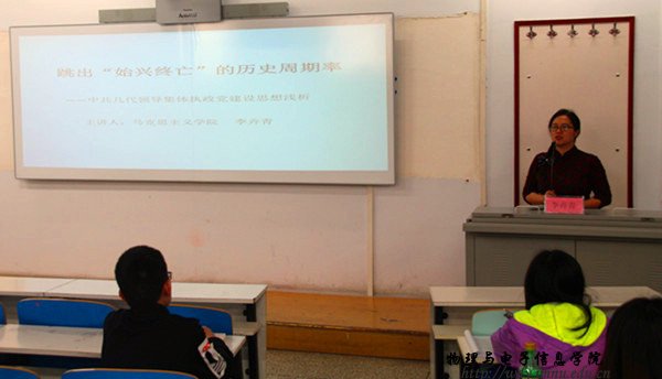 本网讯 2017年5月4日下午,我院于田楼第十公共教室进行了第三次入党积极分子分党校培训课程。本次党课以“跳出始兴终亡的历史周期率”为主题,特邀法政学院教授李卉青老师担任主讲人并由我院团总支书记萨其尔老师主持。
