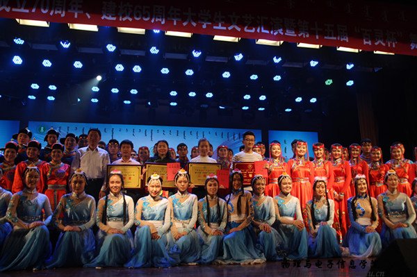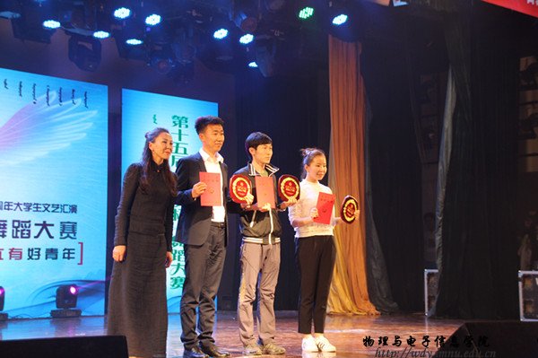 伴随着所有节目的全部结束,主持人宣布获奖单位和个人名单,我院团总支书记萨其尔老师作为学院代表上台接过第十五届“百灵杯”舞蹈大赛二等奖奖牌与最具人气奖,并且萨老师与塔林托亚老师还获得优秀指导老师奖项。在晚会结束后,我院党总支副书记何小龙老师与舞蹈演员们以及工作人员们亲切握手并合影留念表示祝贺。至此,第十五届“百灵杯”文艺汇演已全部结束。本次比赛荣获佳绩也显示出js333线路检测中心对大学生文化艺术活动的支持力度,舞蹈演员们也始终秉承着为学院争光的态度,努力训练,不怕累不怕苦,他们的完美表现再一次向全校展示“物电”精神!