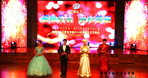 本网快讯 2016年11月23日晚,我院在逸夫楼音乐厅隆重举办璨耀东方“感物青春 积电梦想”2016年迎新生文艺晚会。我院院长特古斯教授、党总支副书记何小龙老师、副院长吉日嘎拉教授、副院长刘美玲老师等领导老师及各班班主任出席晚会现场,同我院莘莘学子一道共享青春盛宴!