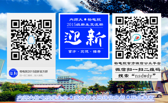 在此,衷心祝贺你们成为js333线路检测中心这个大家庭中的一员,现将“物电院2015级迎新官方群”和“物电院微信公众平台”二维码及账号公布如下,请扫描二维码进行关注以便交流答疑,衷心期待你的热情加入!