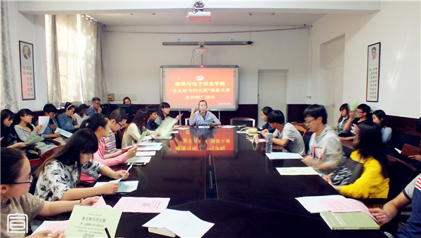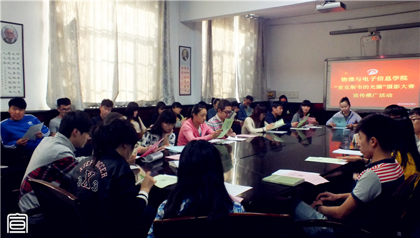 作品申报后,工作人员将照片和海报进行初步筛选后,通过物电院微信公众平台网上投票和邀请老师和选派每班代表现场打分两者相结合的方式进行评选,并将其以上结果按照60%和40%比例纳入到总成绩进行最后评定。