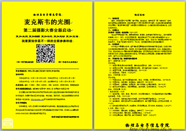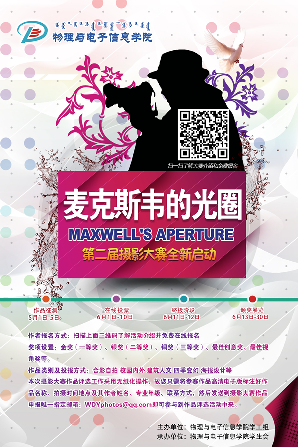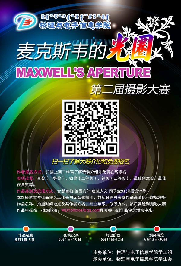 详情内容及宣传单欢迎点击下载附件:“麦克斯韦的光圈”摄影大赛宣传单附件下载.doc