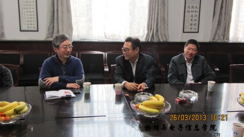 首先,特古斯院长从学院简况,学科发展、人才引进、院庆、日常管理以及下一步的工作思路等方面向陈书记作了重点汇报。在认真听取我院的工作汇报后,陈书记作了重要讲话。他对物电院近年来良好的发展势头,清晰的工作思路表示肯定,并对近年取得的成绩给予高度评价,同时也为学院的未来发展和定位提出了宝贵的意见。