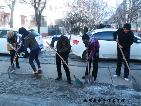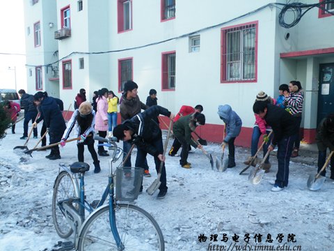 为方便我校教职工及其家属的出行,实践雷锋精神,我院于2012年11月22日在内蒙古师范大学家属楼组织学生会志愿者开展冬季“破冰”活动。