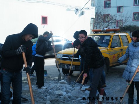 活动期间,我院志愿者不畏严寒,争先恐后的挥动着铁锹清扫路上的积雪,在同学们的共同努力下,活动顺利完成。家属院的居民对同学们无私奉献的精神大为赞赏,纷纷向同学们表示感谢。