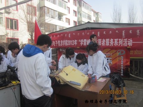 为推进我院“学雷锋”活动的深入开展,大力弘扬雷锋精神。2013年3月3日,我院科协在师大家属院开展了义务维修活动。团总支萨其尔老师、学工办呼和老师到活动地点指导工作。