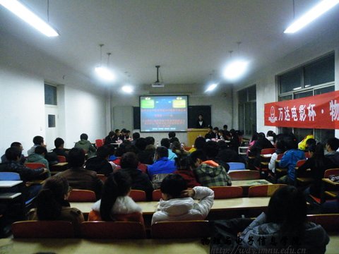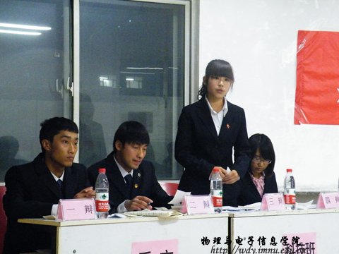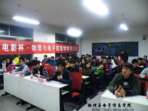 2012年11月10日晚7时30分,我院在田楼210室成功举办2012级新生“万达电影杯”辩论赛,担任此次辩论赛的评委有生活部部长马金辉,文艺部副部长鲁博以及团总支组织委员刘志欣。