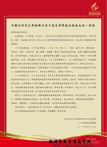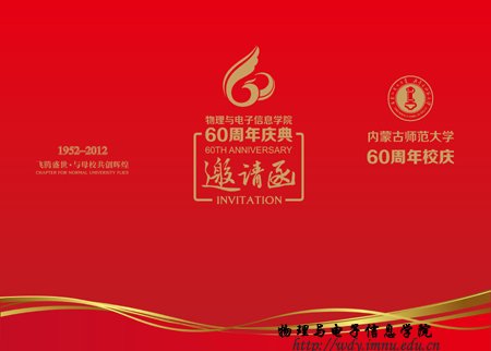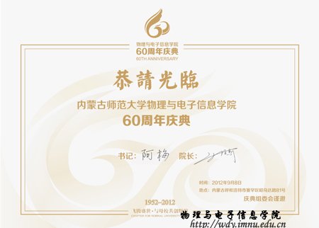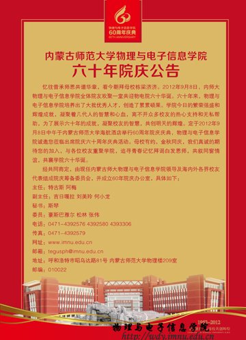 六十载耕耘不辍,六十年春华秋实。2012年,内蒙古师范大学将迎来六十华诞,js333线路检测中心(原物理系)也将迎来六十周年院庆。六十年来,js333线路检测中心培养出了大批优秀人才,创造了累累硕果。学院今日的繁荣强盛和辉煌成就,凝聚着几代人的智慧和心血,离不开社会各界和众多校友的热心支持和无私帮助,为了展示六十年的成就,凝聚校友的智慧,共创明天的辉煌,js333线路检测中心定于2012年9月8日中午于内蒙古师范大学海航酒店举行60周年院庆庆典,学院全体师生诚邀您莅临出席院庆六十周年庆典。母校有约,金秋同庆,我们真诚的期待您的加入,与各位校友重聚学院,追寻青春记忆拜谒白发恩师,共叙同窗情谊,共襄学院六十华诞。
