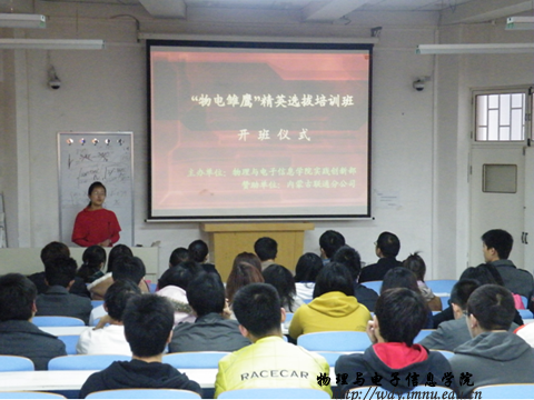 10月30号上午8点整,我院在田楼第十一公共教室举行 “物电雏鹰”精英选拔培训班第一期开班仪式。出席开班仪式的有电子系主任梁学军老师、电子系副主任海鹰老师、电子系高焕生老师、电子系张珏老师、电子系杨帆老师。开班仪式由实践创新部副主任张丽娜老师主持。