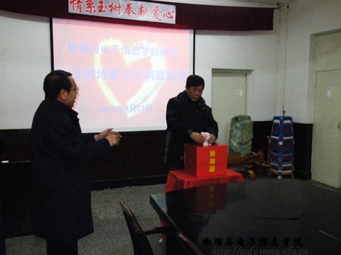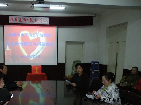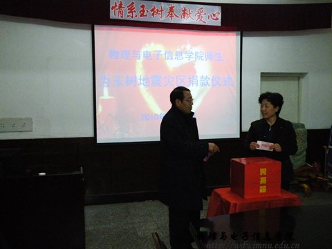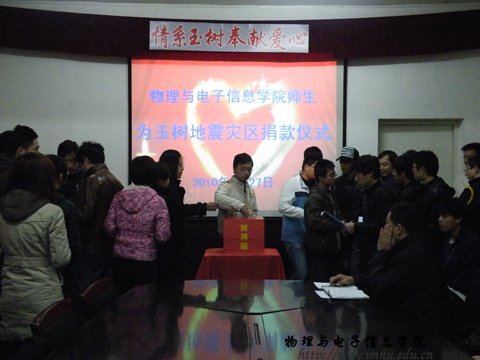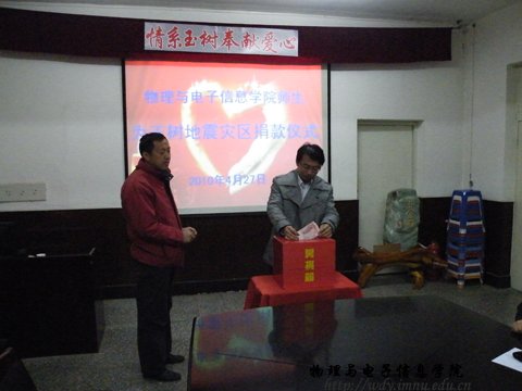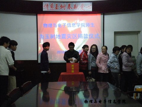 震灾无情,人间有爱。自玉树地区发生7.1级地震后,全国各族人民纷纷行动起来,以各种方式支援灾区。4月27日下午,我院师生汇集在物理楼会议室,向玉树灾区人民捐款。
