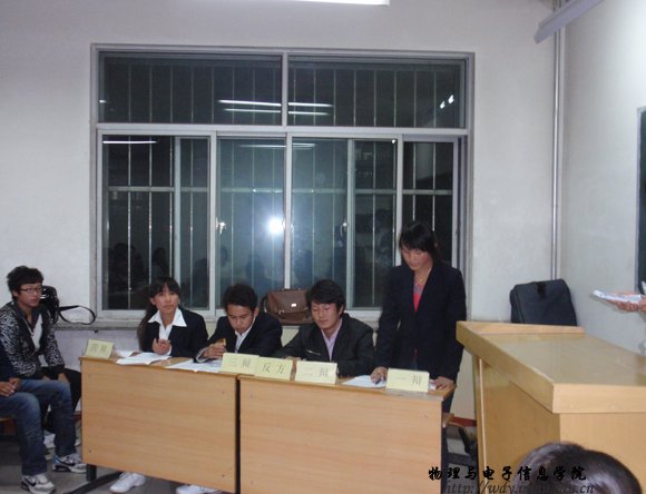为纪念新中国成立60周年,活跃校园文化,培养大学生团结进取的精神。体现大学生积极向上的精神状态。我院学生会学习部组织举行心理健康活动月之09级新生辩论赛。