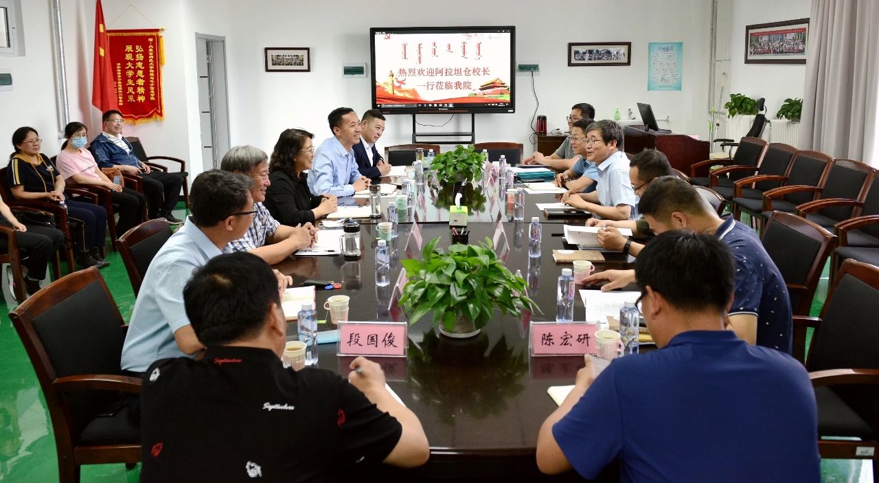 阿拉坦仓校长充分肯定了我院取得的成绩,希望我院继续努力,以学科建设为龙头,强化内涵建设,全面提升教育教学质量。同时就学院师资队伍建设、科学研究、博士点申报等工作提出了指导性意见和建议。