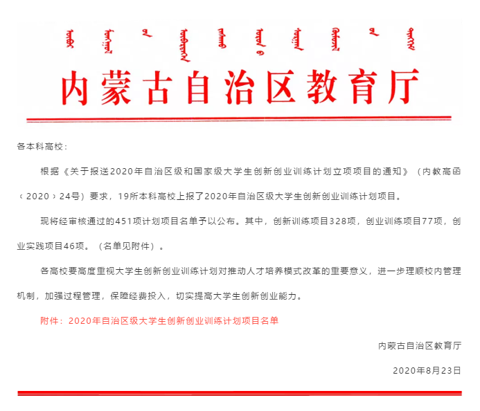 近日,自治区公布了2020年自治区级大学生创新创业训练计划项目立项结果,评选出2020年自治区级大学生创新创业训练计划项目451项,我校共立项28项,其中我院申报的《青你空间—学生公益服务平台》和《天体在强弯曲时空中轨道运动的研究》2个项目获批2020年自治区级大学生创新创业训练计划立项(见附件)
