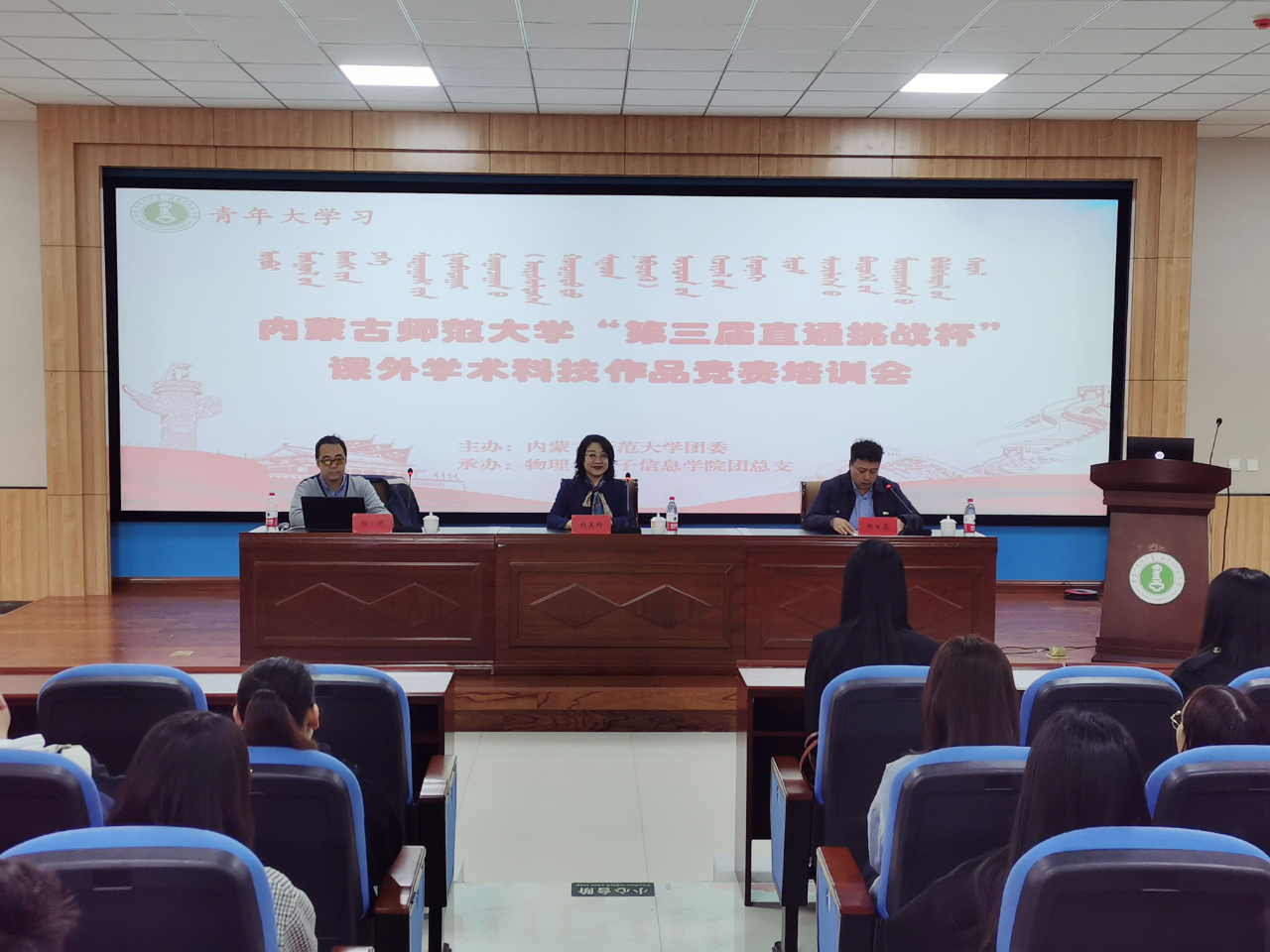 为做好内蒙古师范大学第三届“直通挑战杯”课外学术科技作品竞赛的各项筹备工作,切实提升学生参赛作品的质量和水平,3月21日,由校团委主办、js333线路检测中心团总支承办的内蒙古师范大学第三届“直通挑战杯”课外学术科技作品竞赛培训会在盛乐校区学生事务中心一楼举行。会议分别由校团委副书记包双成、校团委挂职副书记那日苏主持,北京林业大学校团委副书记、副研究员张骅、内蒙古民族文化产业研究院院长董杰、物电院杨帆副教授分别围绕“挑战杯”自然科学类学术论文、哲学社会科学类社会调查报告和学术论文、科技发明制作的竞赛作品提升做了主题培训,js333线路检测中心党委书记刘美玲、校团委副书记包双成、 校团委挂职副书记那日苏出席,学院学就办副主任、团总支负责人、各学院挑战杯赛事负责人、本届赛事参赛选手、下届赛事意向参赛选手共600余人参加了宣讲会。