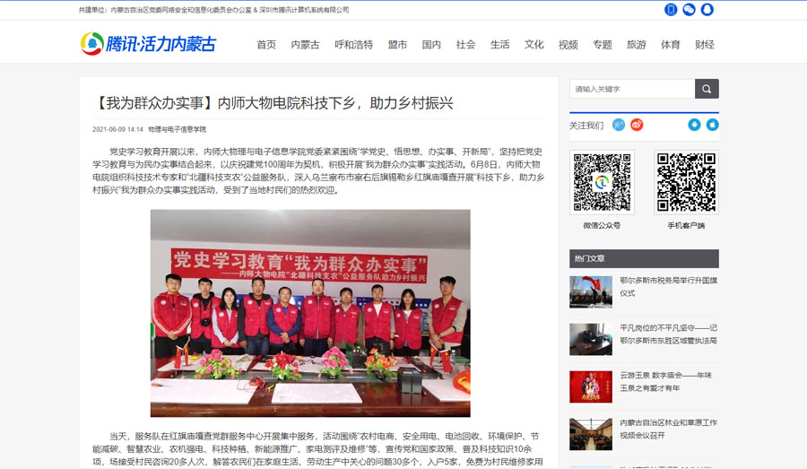 据悉,内师大物电院立足高校理工科大学生实践,坚持“科技下乡”20多年,“北疆科技支农”公益服务队先后赴内蒙古农村66个,开展公益服务500余次,服务农民群众10000余人,帮助农村劳动力就业,协助当地农民开设家电维修站店10余家。参加实践的学生升学就业累计500余人,每人每学年劳动课时累计120学时以上,服务队先后荣获“三下乡”社会实践国家级奖项2项,自治区级奖项10余项,为打造祖国北疆这道亮丽风景线做出贡献。