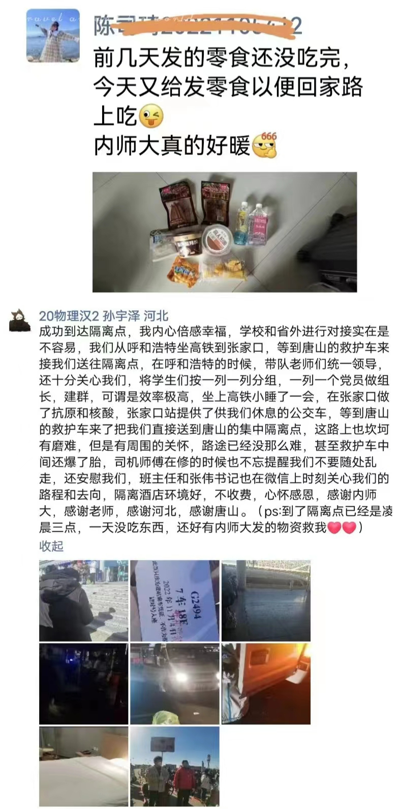 师大到吉林跨越一千多公里,即使路途遥远,在校方和政府的共同努力下,所有人有条不紊的回到了家乡;从盛乐到呼市再到长春,无处不透露出双方对学生的关怀,一路上如同师长、家人始终陪在身边。集中隔离一夜后,回到社区进一步隔离;希望疫情如落叶,在返乡的秋风下,归于平静风起叶灭。
