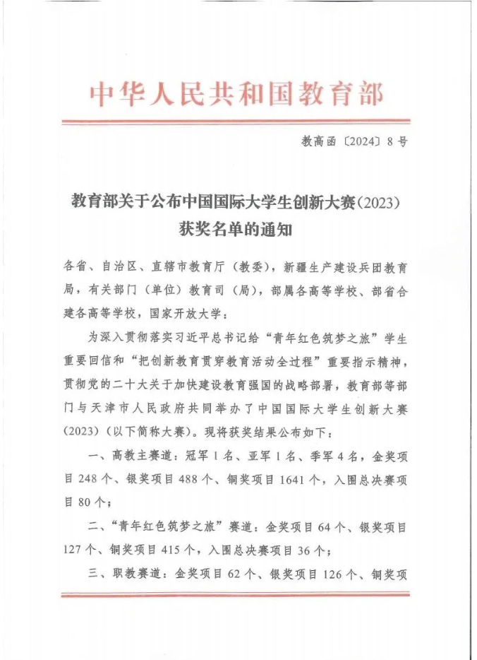 据悉,中国国际大学生创新大赛(2023)由教育部等12个部门会同天津市人民政府主办,天津大学承办。2023年12月3日至6日,全国总决赛在天津大学举行,该项赛事共有来自国内外151个国家和地区、5296所学校的421万个项目、1709万人次报名参加,经过校级初赛、省级复赛、网上评审等环节的层层选拔,1260个优秀项目脱颖而出参加总决赛现场赛。