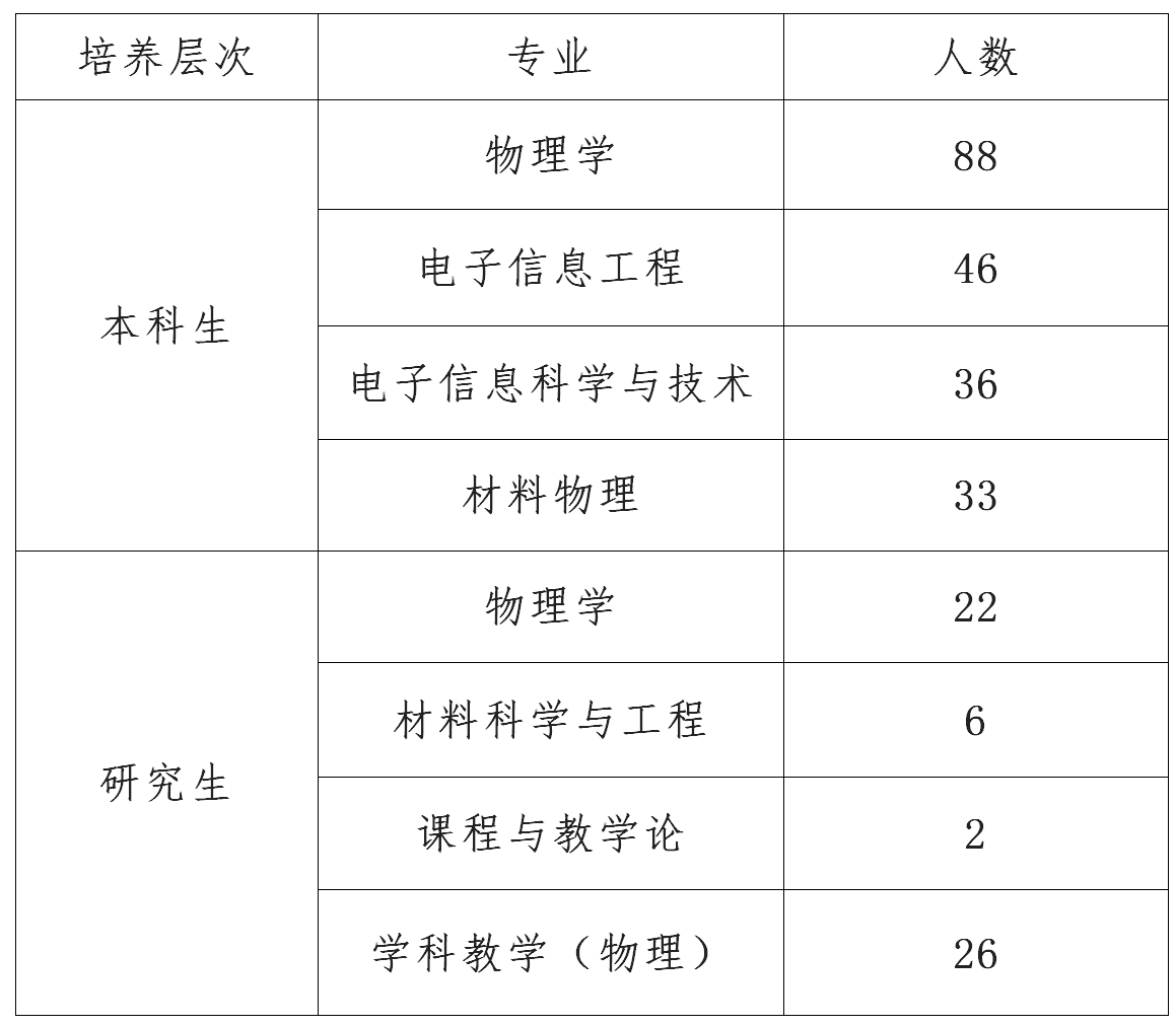 学院设有物理学系、电子学系、材料系、实践创新部和实验中心,设有物理学(蒙、汉)、电子信息工程、电子信息科学与技术(师范类)、材料物理4个本科专业,其中物理学专业被评为“自治区品牌专业”,材料物理与化学为自治区重点学科,在校本科学生1065人。现有物理学一级学科博士点一个,两个一级学科硕士学位授权点,分别是物理学和材料科学与工程一级学科硕士点;另有两个与物理教师教育有关的二级学科硕士学位授权点,分别是课程与教学论(物理)学术型硕士点和学科教学(物理)专业学位硕士点,在校研究生126人。