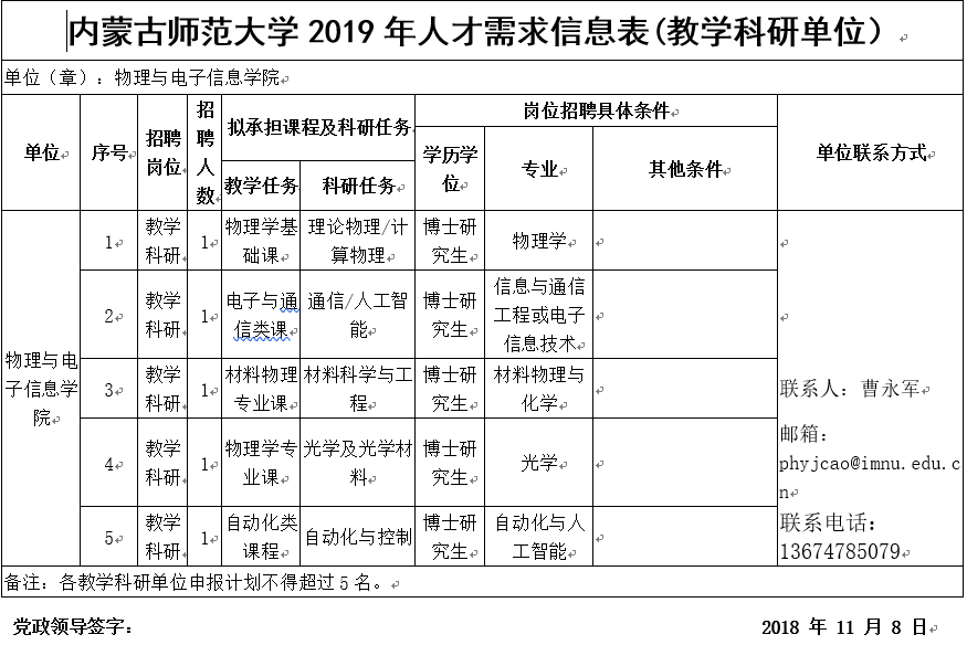 内蒙古师范大学2019年人才需求信息表(教学科研单位)
