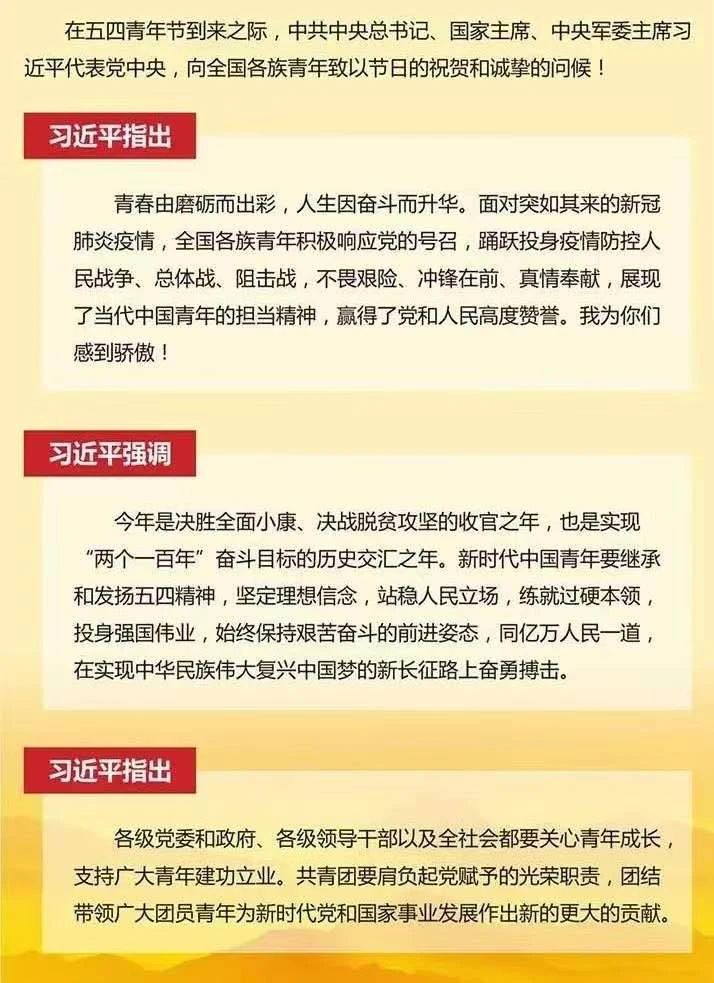 5月3日,习近平总书记发表重要讲话,寄语青年,为深刻学习宣传贯彻习近平总书记五四青年节寄语精神,鼓励广大青年抒发抱负理想,继承和发扬五四爱国精神,我院各团支部积极组织团员青年开展线上学习专题活动。