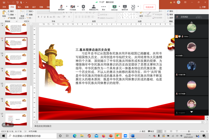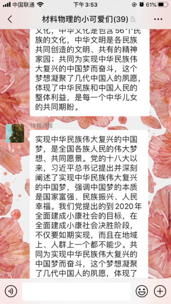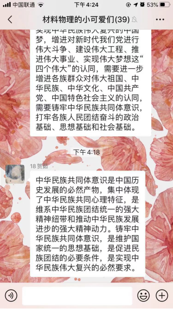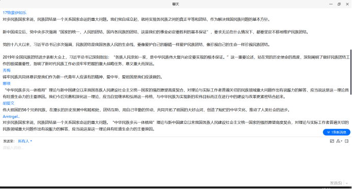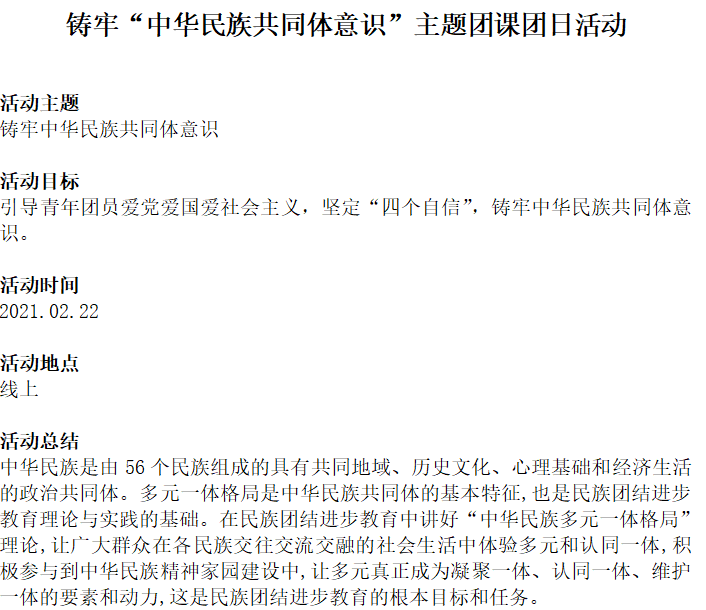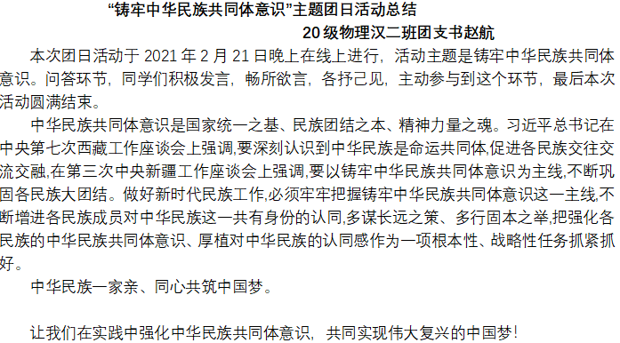 为深入学习宣传贯彻落实党的十九大精神,认真学习宣传习近平总书记在全国民族团结进步表彰大会上的重要讲话精神,引导广大师生进一步凝聚“民族团结一家亲,同心共筑中国梦”的强大合力。自2月19日至2月23日,js333线路检测中心在全院学生中开展了“铸牢中华民族共同体意识”云端主题团日活动。全院28个团支部、共1092人参与活动。活动中同学们直抒胸臆,积极发表对“铸牢中华民族共同体意识”的理解和认识。本次活动旨在增强学生对伟大祖国、中华民族、中华文化、中国共产党、中国特色社会主义的认同,使中华民族共同体意识深深扎根各族师生心中。